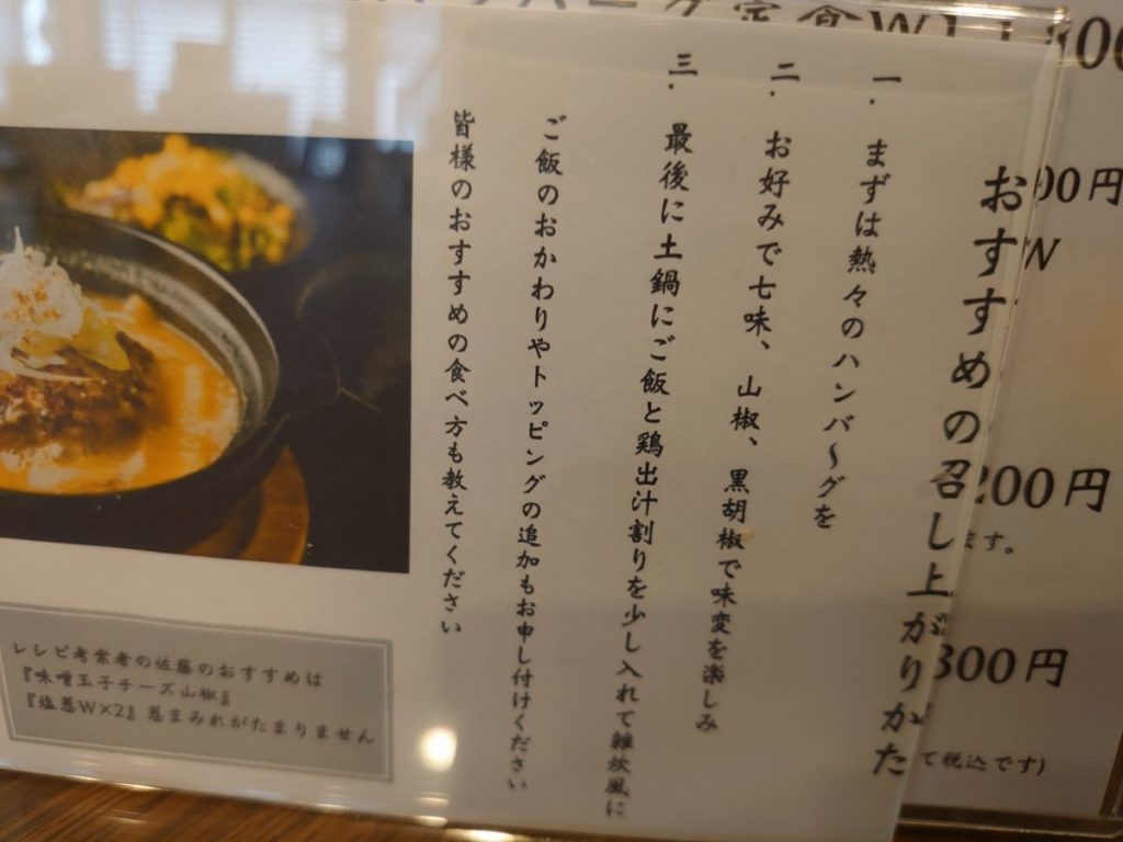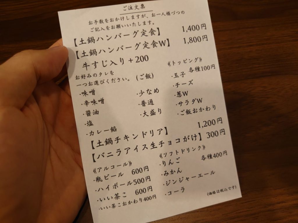メニューは土鍋ハンバーグか土鍋チキンドリアの2種類。