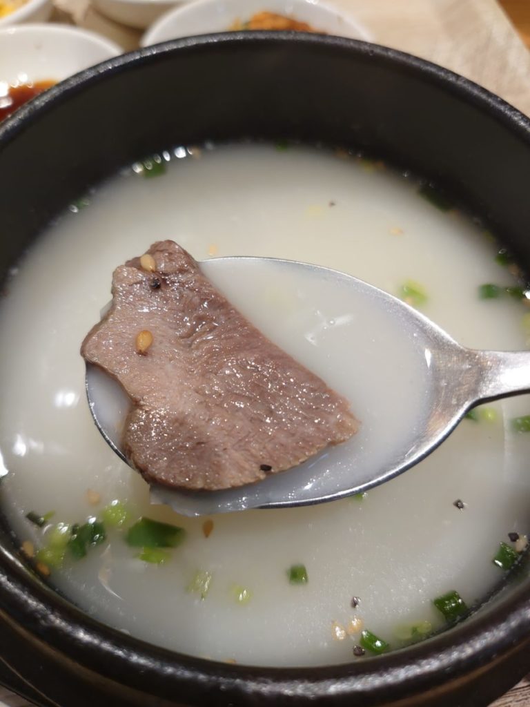 韓国料理でお馴染みの浅く柄は長いスプーンなので飲みにくい。