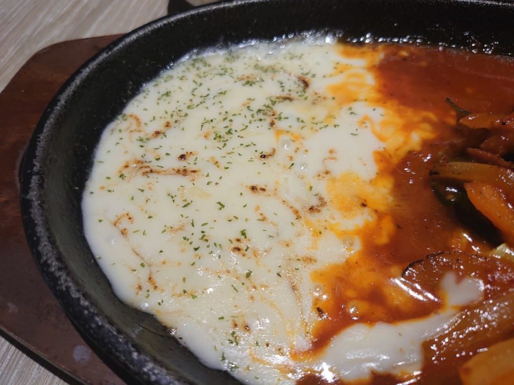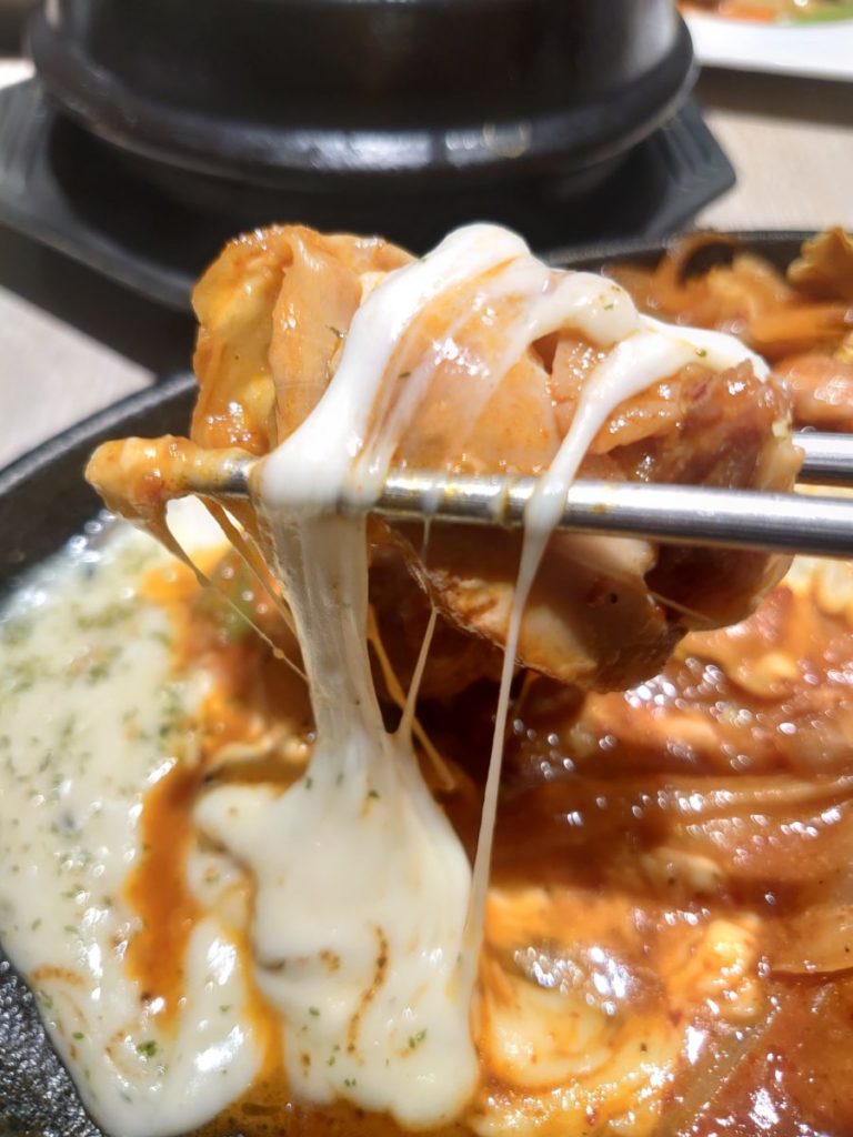 チーズタッカルビは、大きめカットの鶏肉がゴロゴロ。