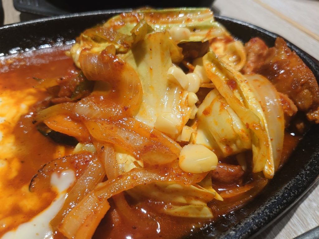 チーズタッカルビ、白スンドゥブチゲ、ライス、サラダとバラバラでの提供でした。