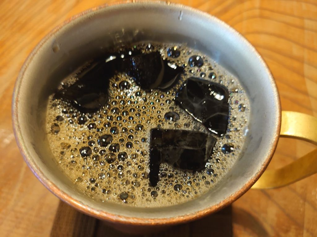 銅製のコップに入ったアイスコーヒーはキンキンに冷えてました。
