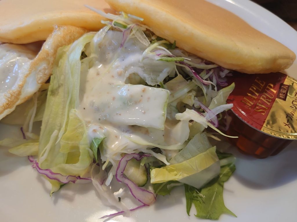パンケーキの下にはサラダと目玉焼きとウインナー2本が隠れていました。