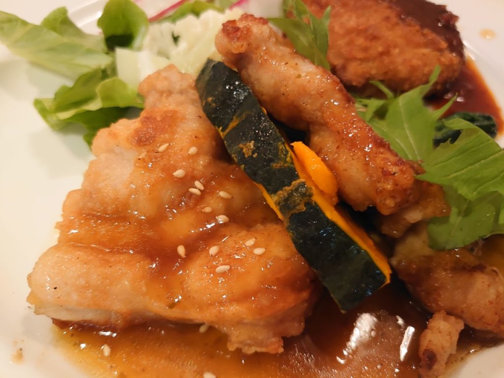 一皿に盛られたチキングリルとコロッケとサラダ。