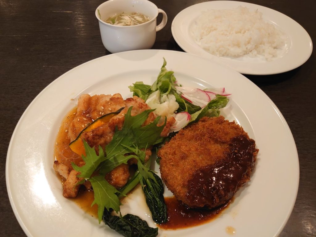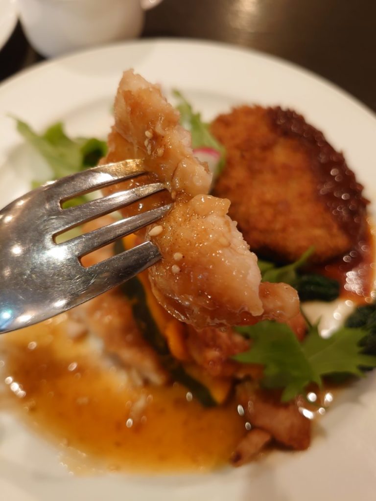 この日の日替わりランチは、若鶏のグリル柚子胡椒風味ソース&ポテトコロッケ。