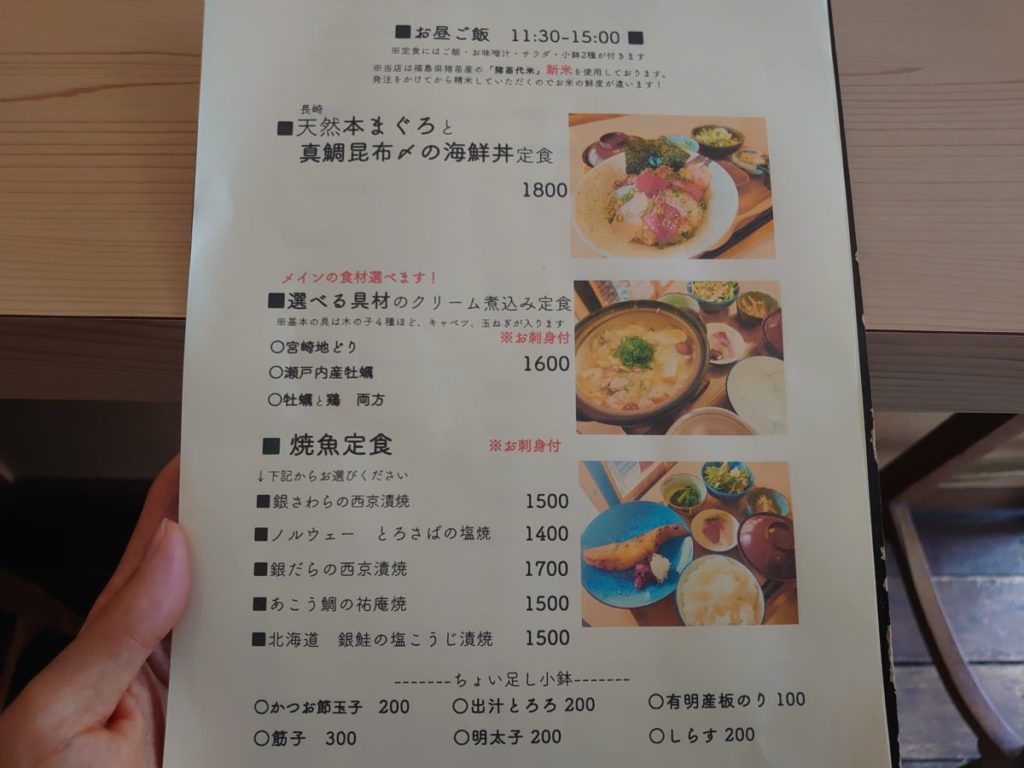 ランチメニューは、海鮮丼、クリーム煮込み定食、焼魚定食というラインナップ。