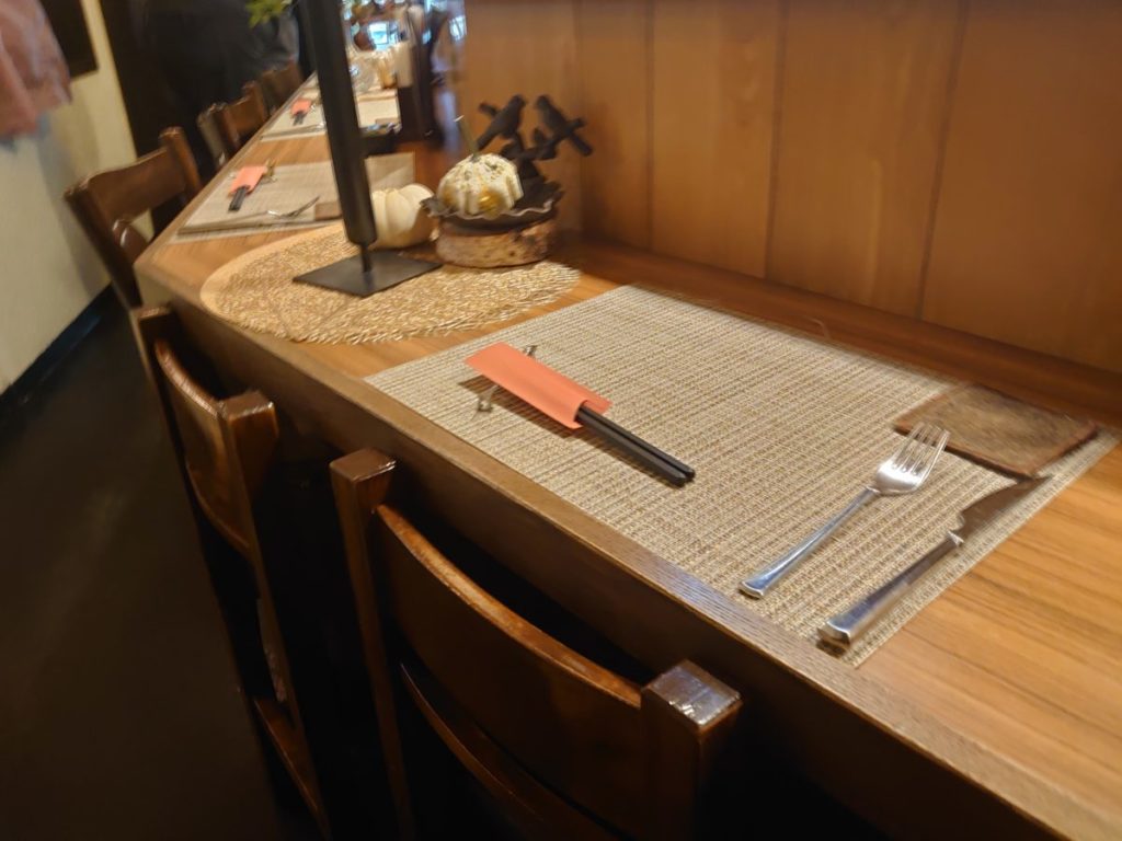 手前にテーブル席が数組と奥に厨房に向き合うようにカウンター席が7席ありました。