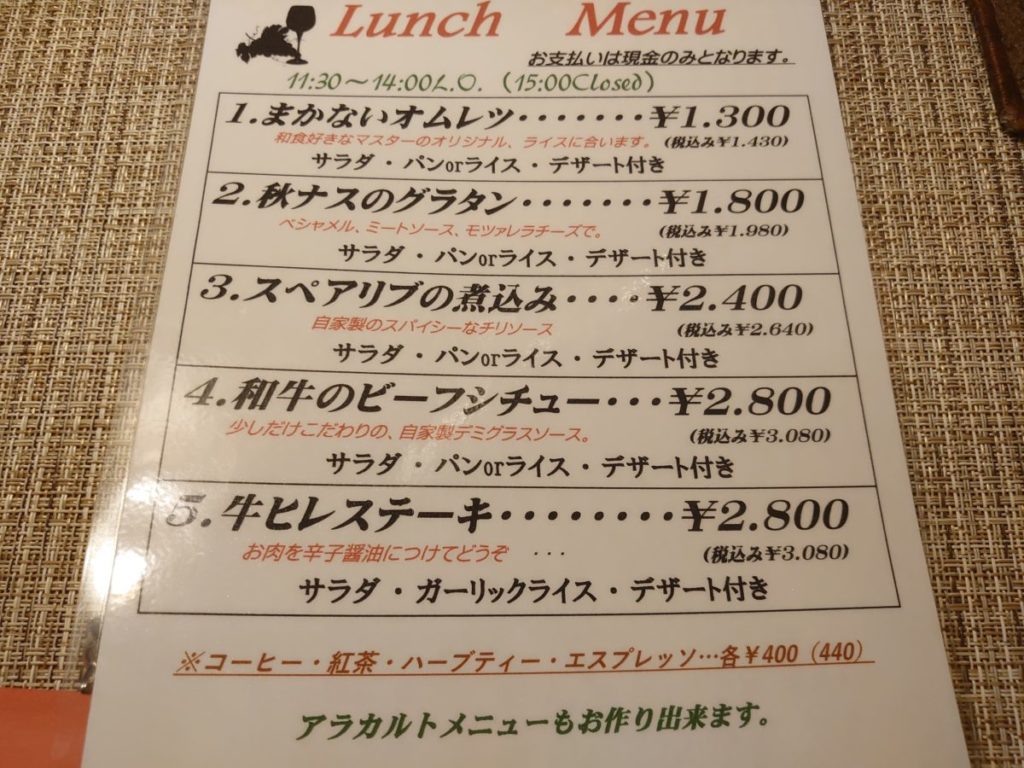 ランチメニューは、1,430円のまかないオムレツから3,080円の牛ひれステーキまで5種類。