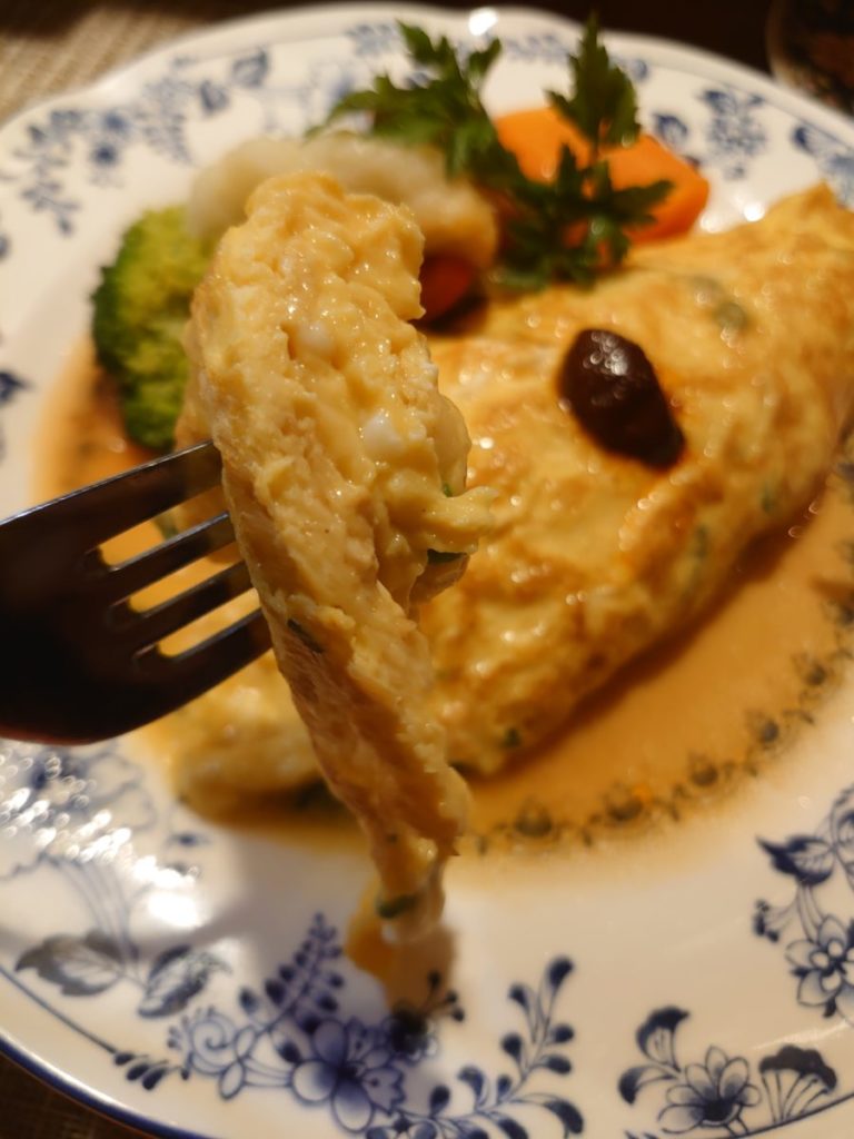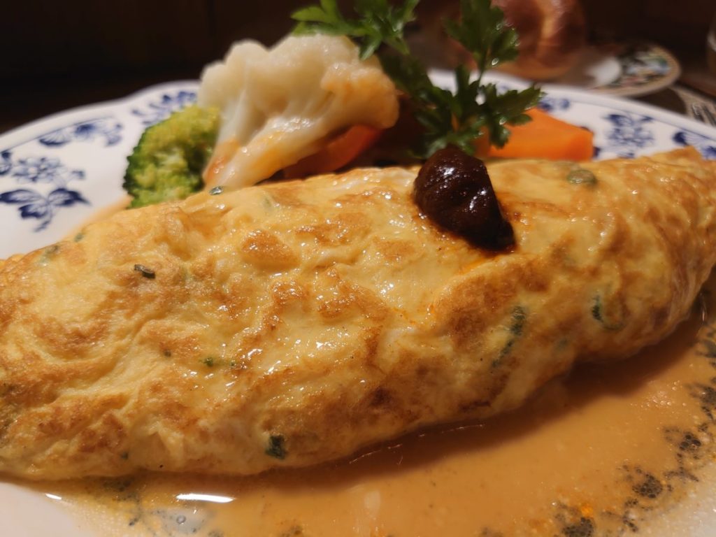 オムレツの外側はふわふわ、中は半熟でとろっとろ。