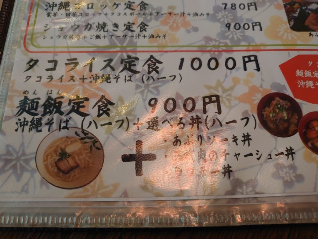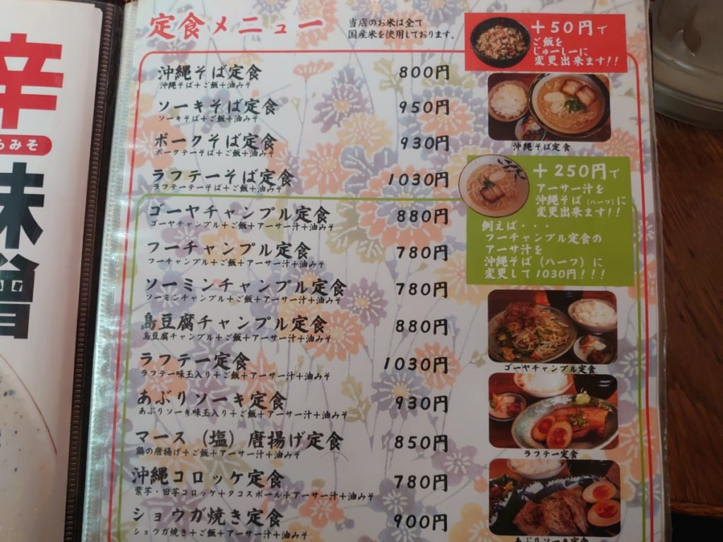 沖縄そば、ゴーヤチャンプル、ラフテー等、沖縄を代表する料理の定食メニューが充実しています。