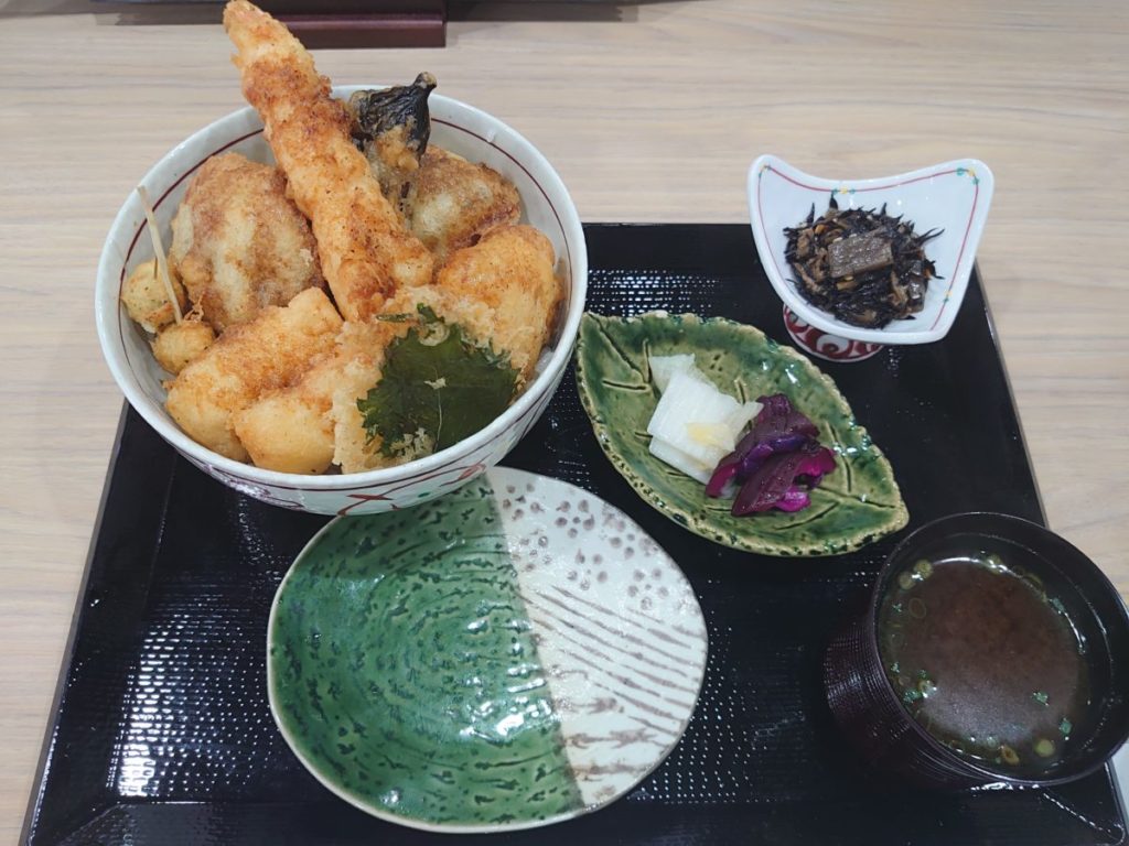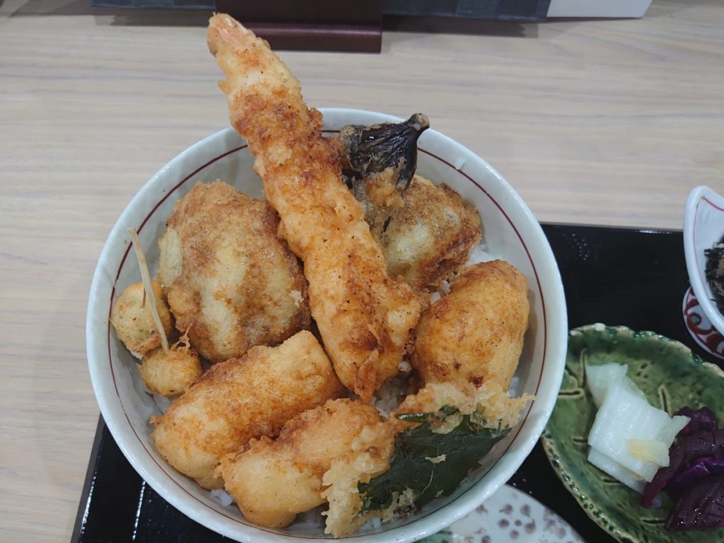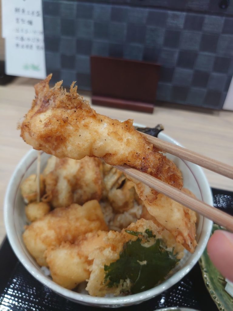 ご飯が見えなくなるくらい丼にぎっしり盛られているわんぱく天丼です。