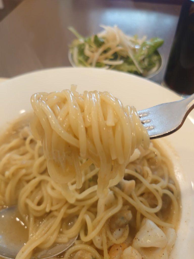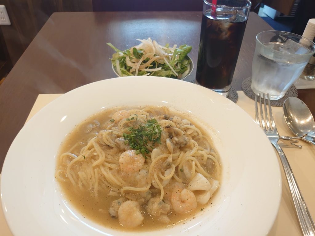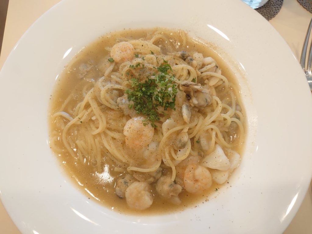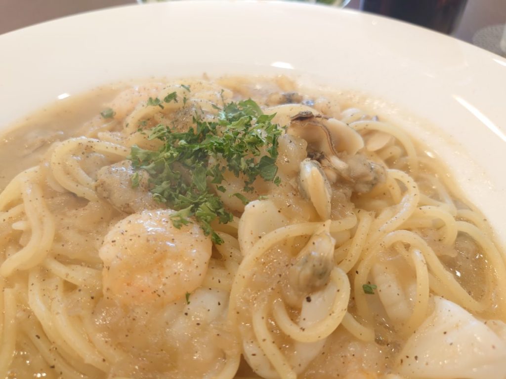 この日のパスタは、シーフードペペロンチーノでした。
