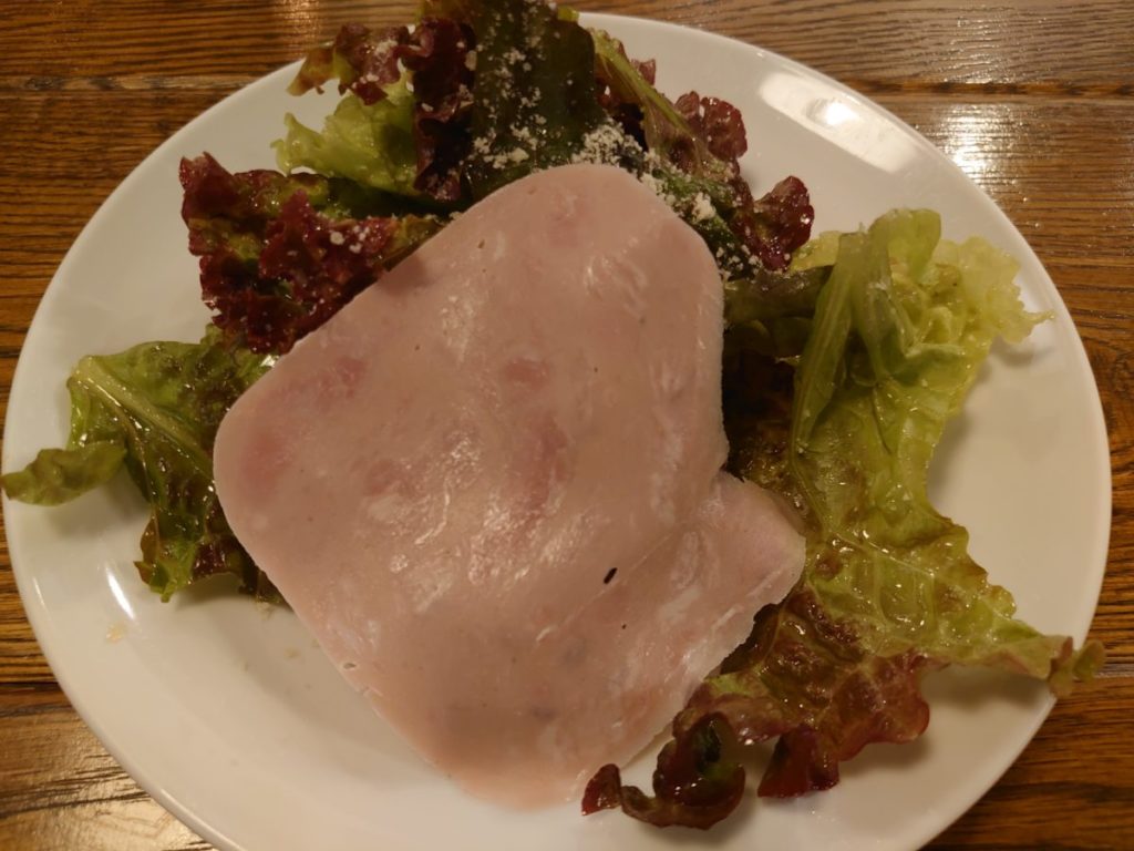 リーフに粉チーズとハムをトッピングしたシンプルなサラダ。