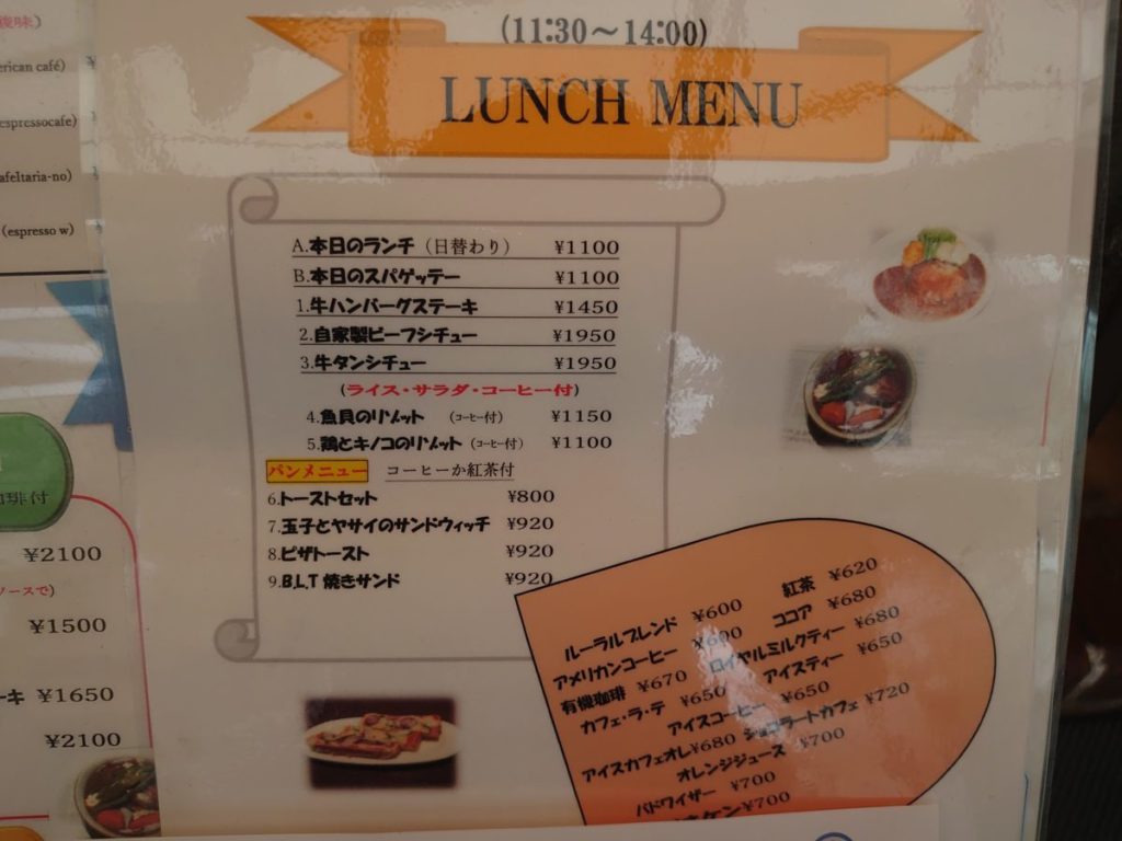 ランチメニューは、ハンバーグやスパゲッティ、サンドウィッチ等の洋食。