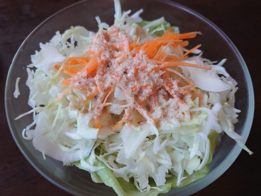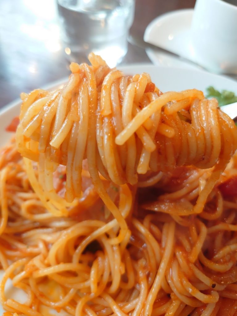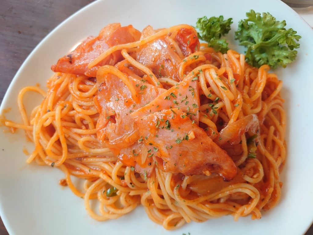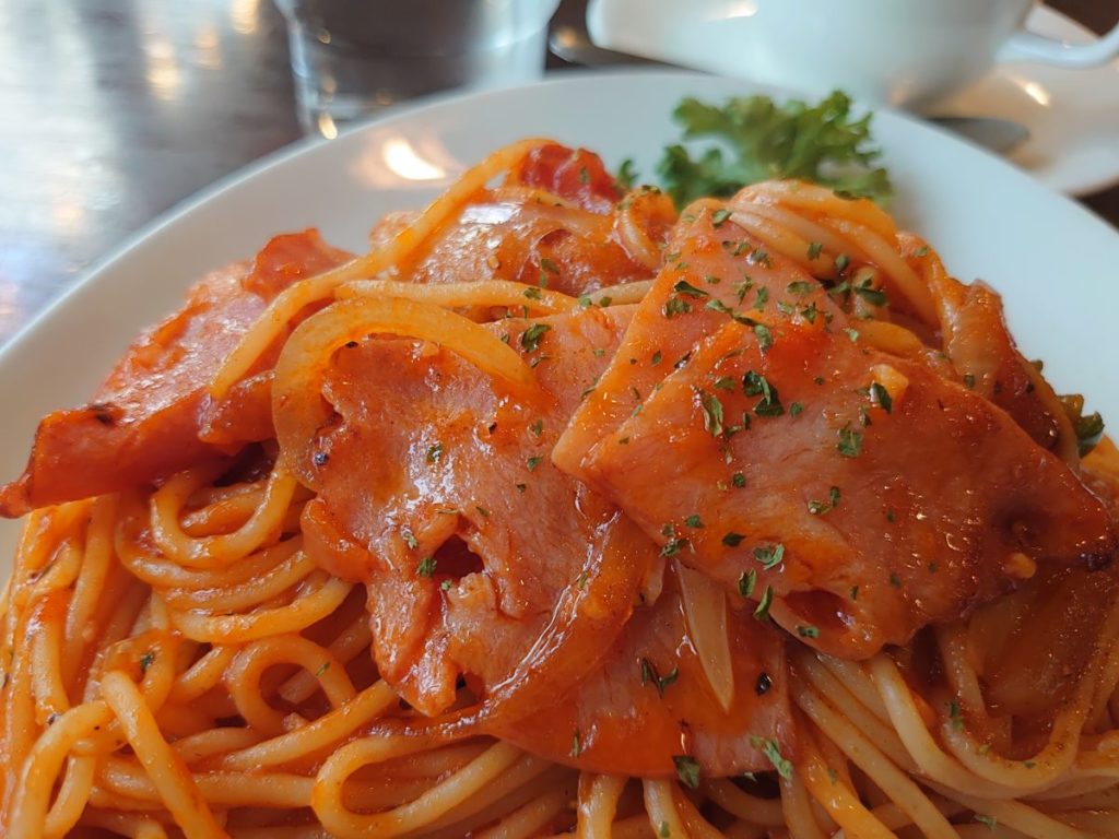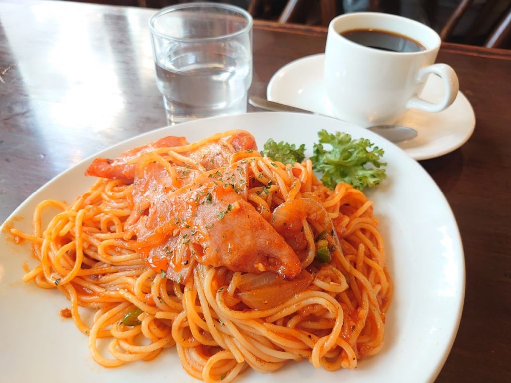クチコミの下調べでオムライスまたはオムカレーをいただくつもりで訪れましたが、サラダとホットコーヒー(または紅茶)が付いたお得なランチセットのことを知り、気が変わってナポリタンのランチセットを注文しました。