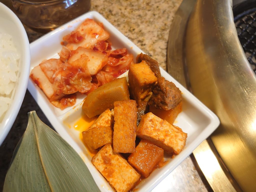 小鉢は、白菜のキムチと、厚焼きと歯応えある肉を甘辛ソースで絡めたもの。