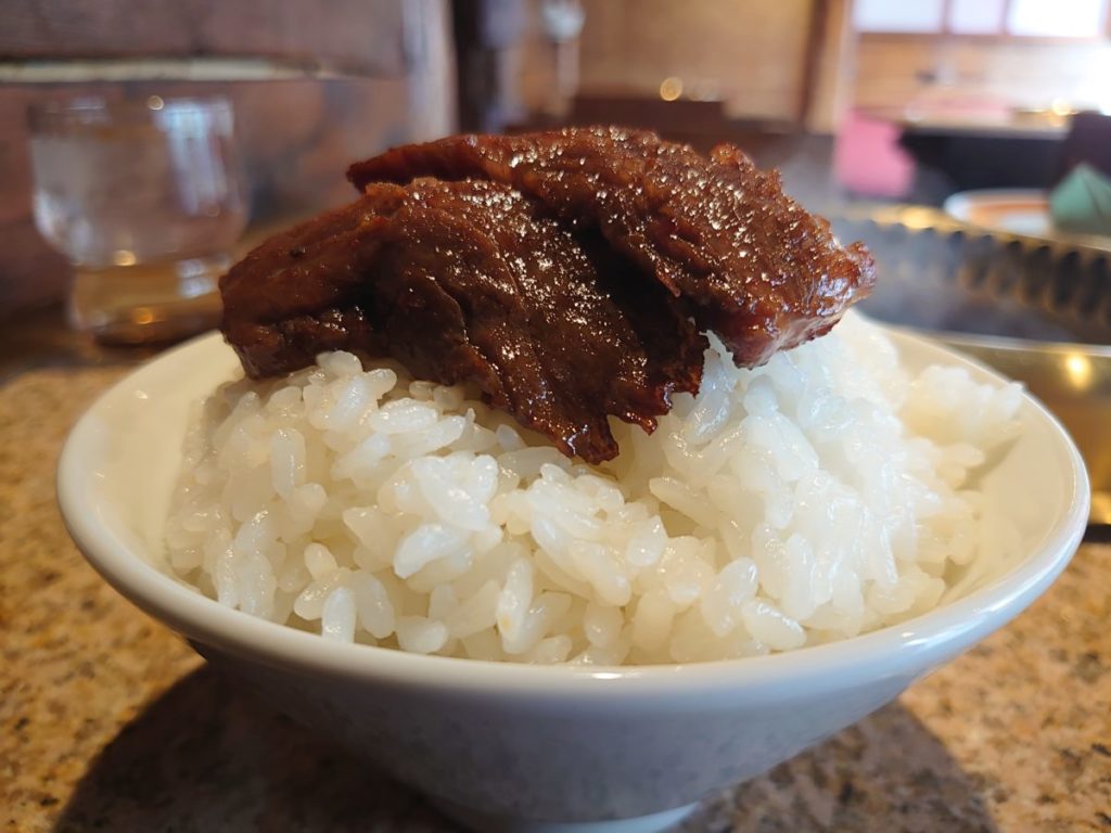 先に焼き上がったハラミからオンザライスで