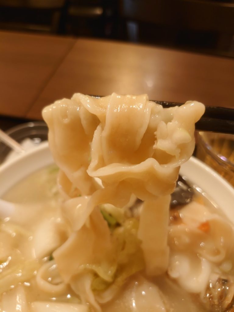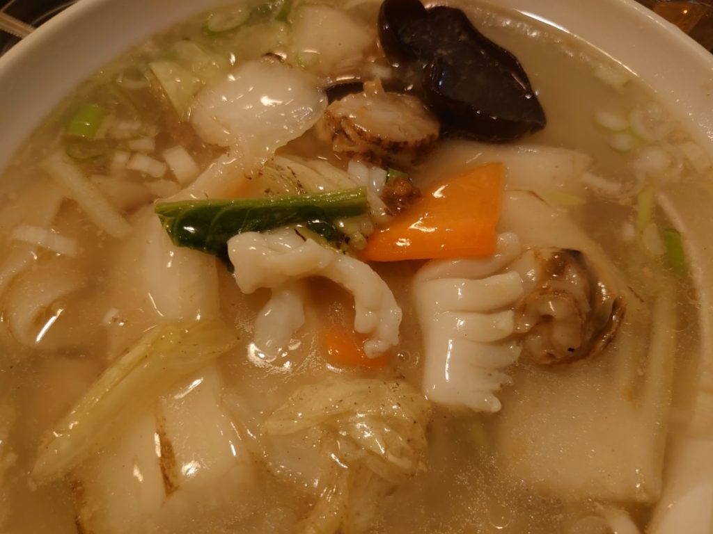 大きい丼に海老やイカ、ホタテ等の海鮮と、大きめカットの野菜がゴロゴロと浮かんでいる豪快な刀削麺。