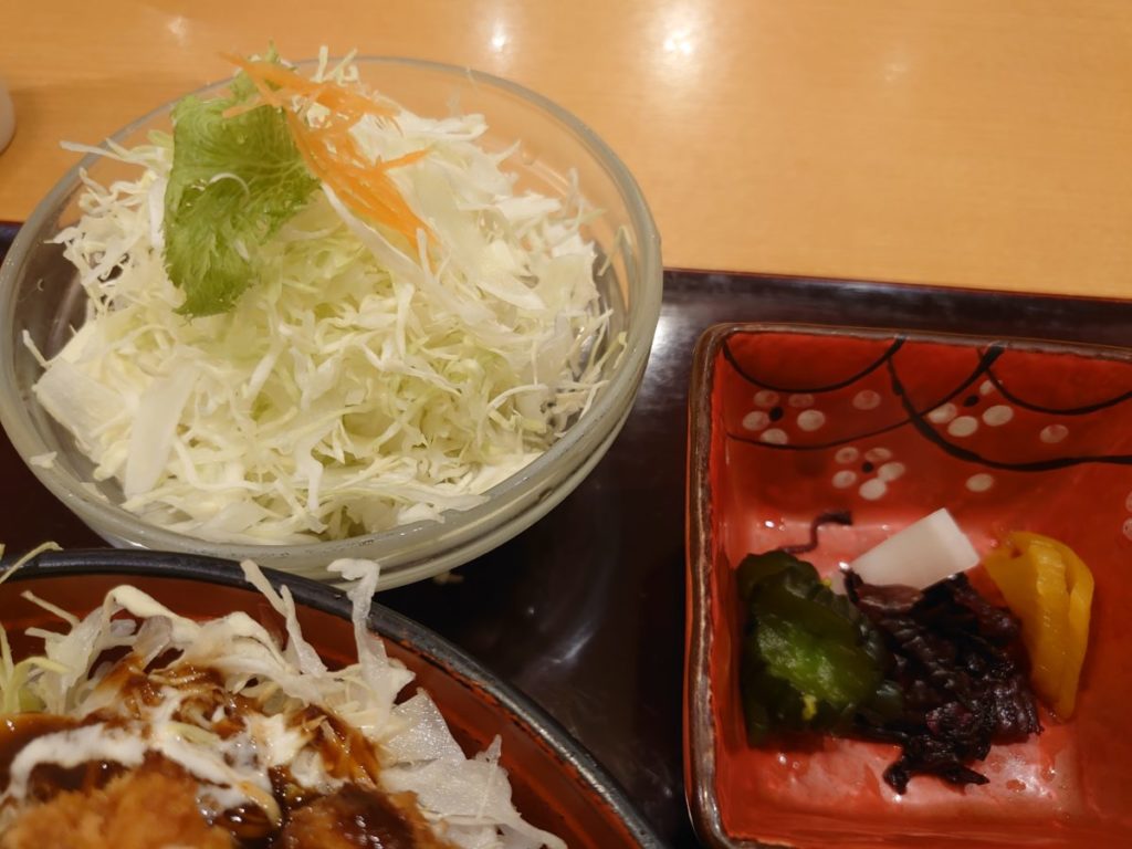 丼も千切りキャベツ、サラダも千切りキャベツ。