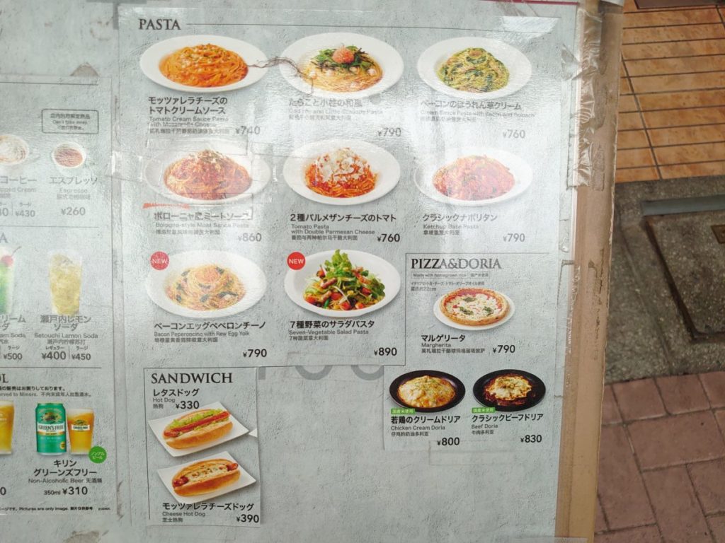 フードメニューは、パスタ、ピザ、サンドイッチ。