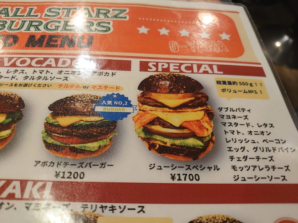総重量550gのジューシースペシャルが気になりつつも、2番人気のアボカドチーズバーガーを注文しました。