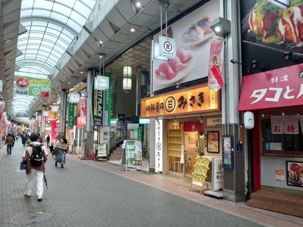回転寿司みさきがあるのは、大山駅南口を出てハッピーロード商店街を川越街道方面へ歩いてすぐのところ。