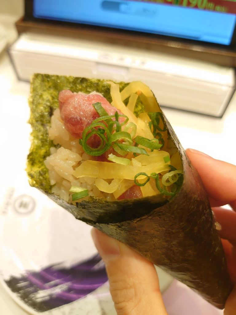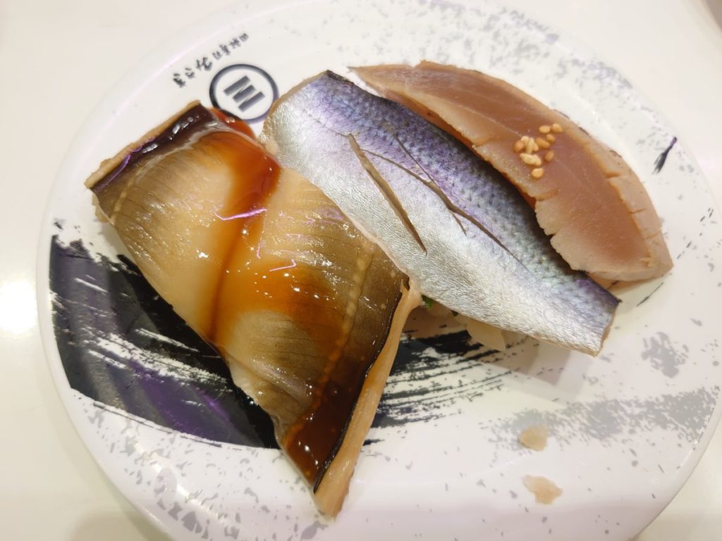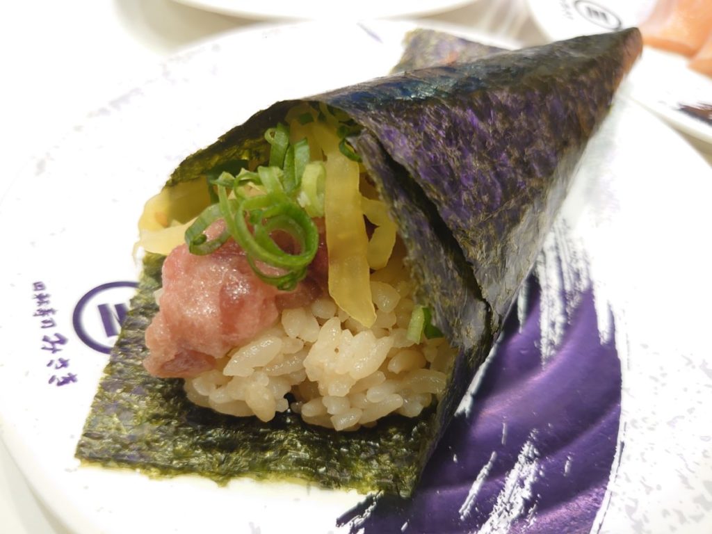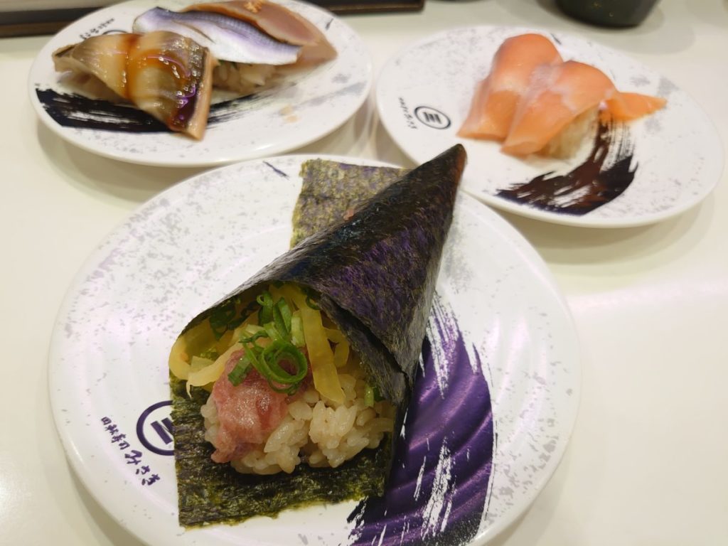 板橋区大山「回転寿司みさき 大山店」で、ランチに王道江戸前三貫盛、生サーモン、天然インドまぐろとろたく手巻を。