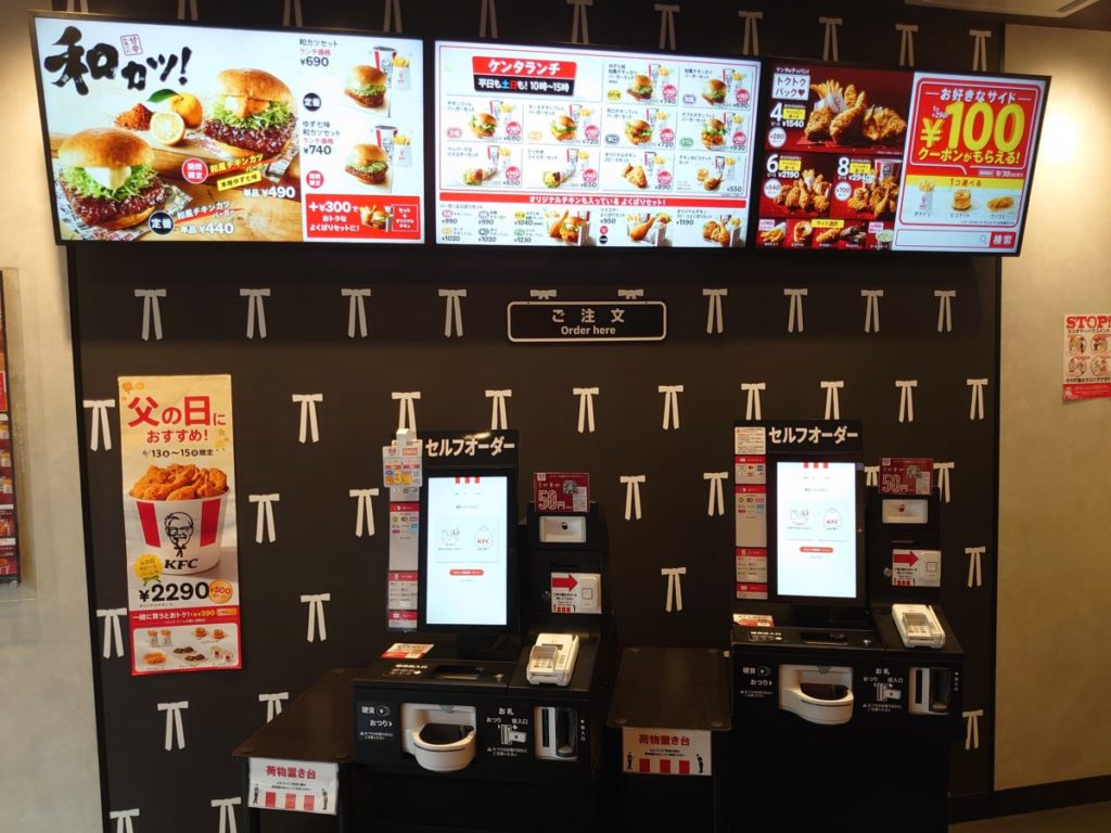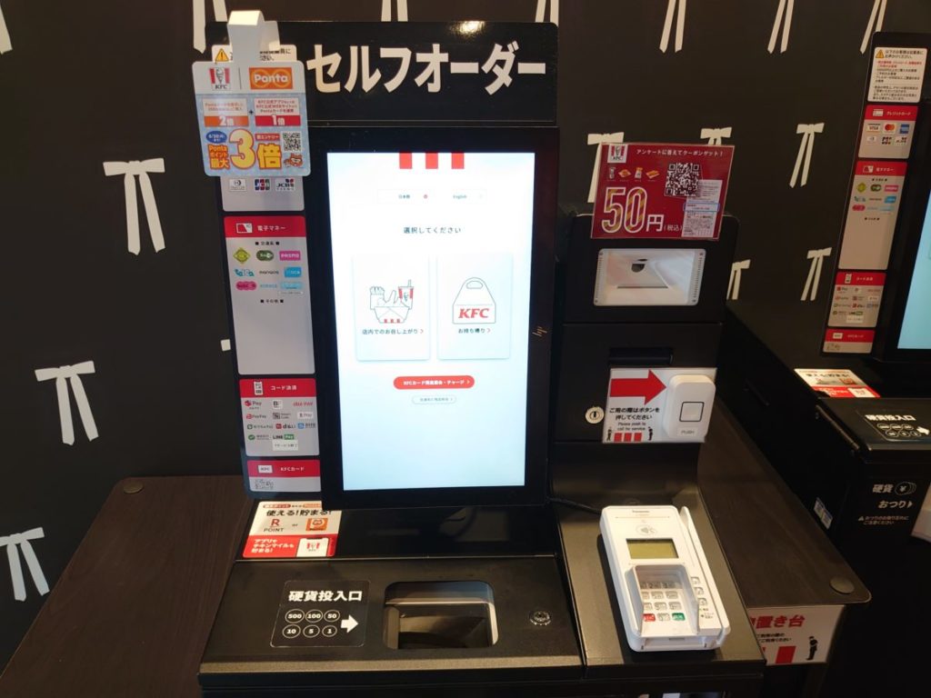 まずは2台あるタッチパネル、または注文口で注文と会計を済ませます。