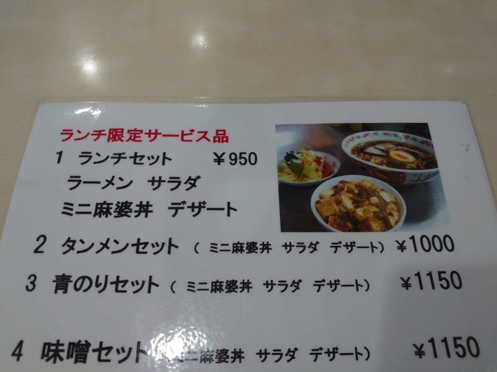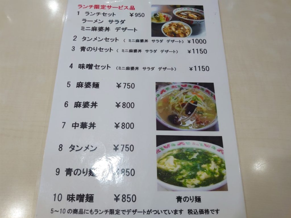 ランチはデザート付きの麻婆麺やタンメンが750円〜。