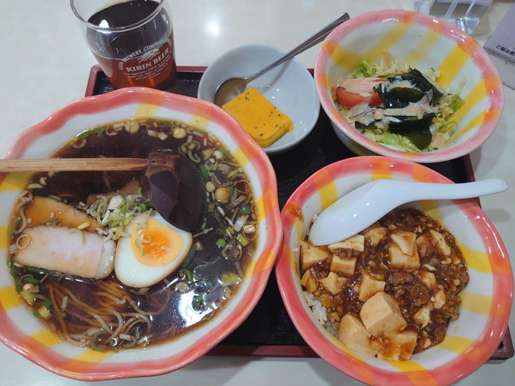 ラーメン、サラダ、ミニ麻婆丼、デザートのランチセットを注文しました。