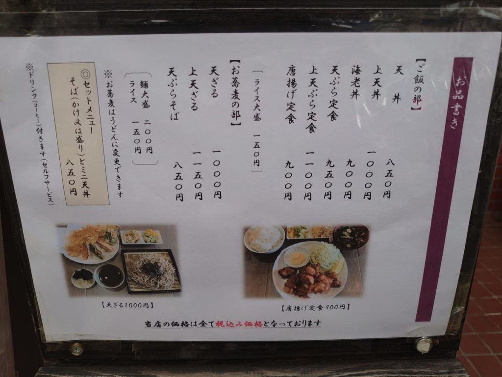 ランチメニューは、天丼や天ぷらそばが850円〜。