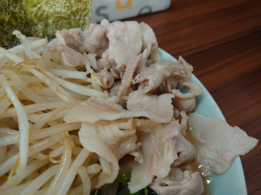 チャーシュー2枚に豚バラ肉?、味玉、もやし、ほうれん草、海苔3枚。