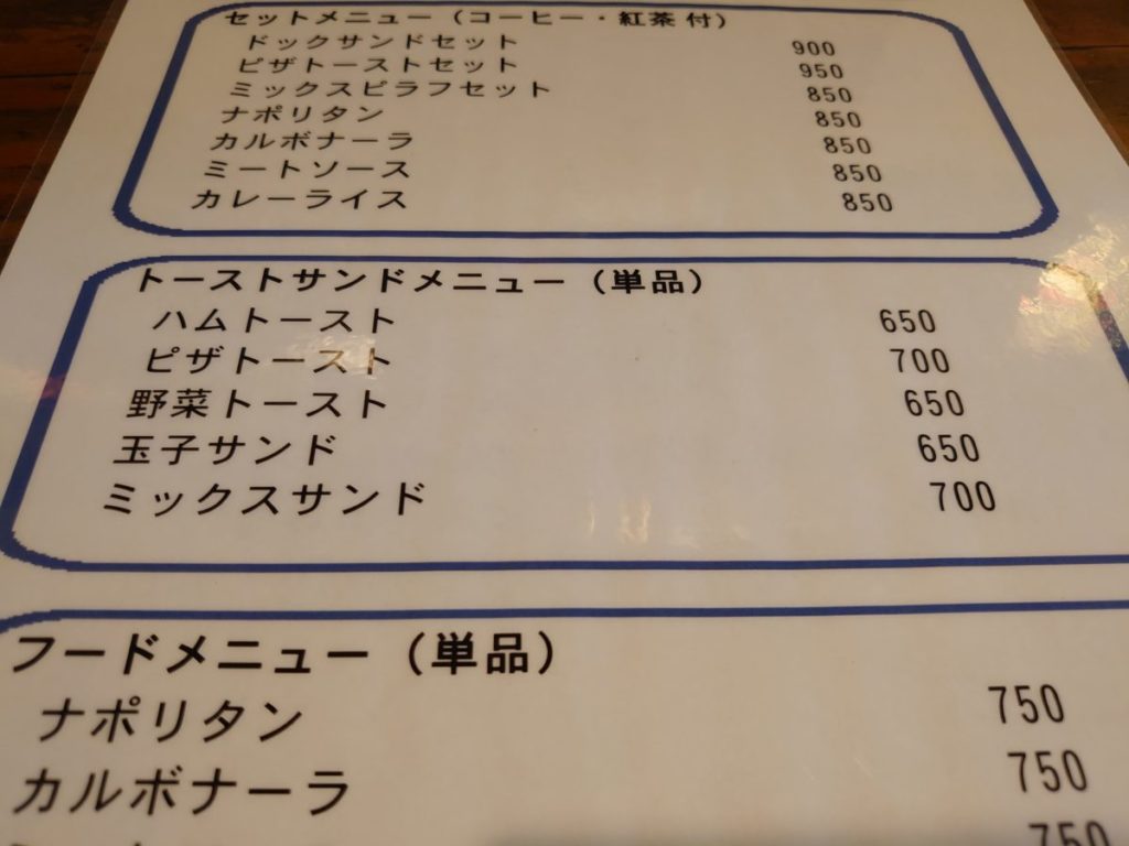 文字だけのメニュー表で想像する必要がありますが、トーストやサンドイッチ、パスタやピラフ、カレーライス等、フードメニューが充実しています。