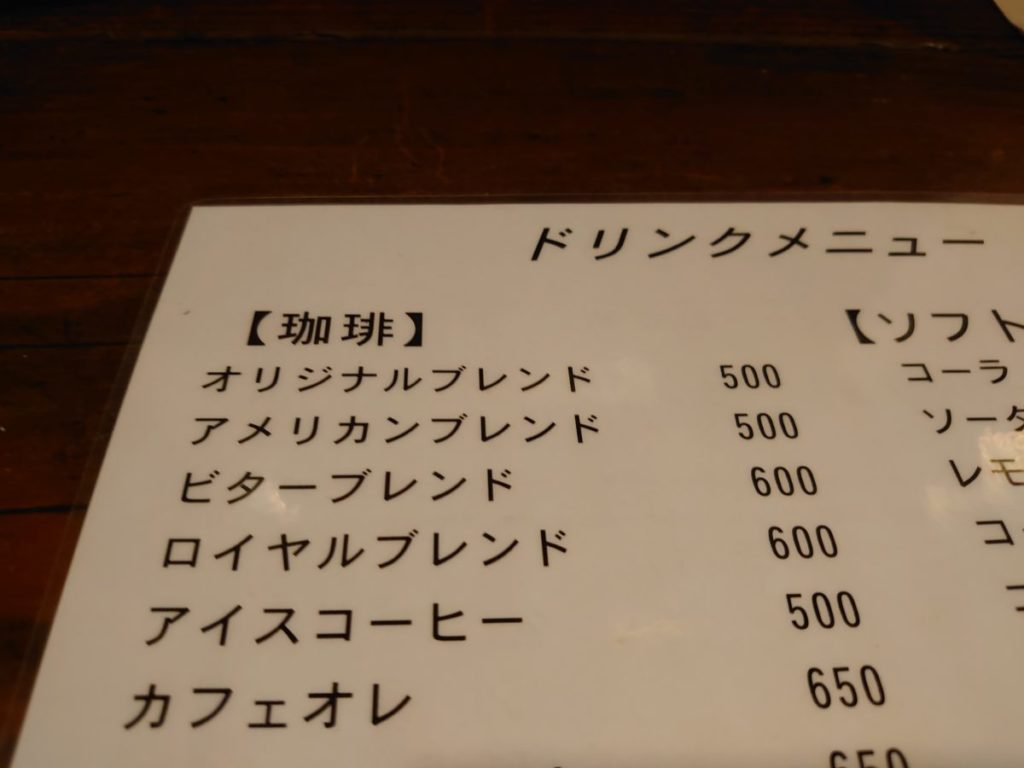 コーヒーまたは紅茶が付いた700円のサービスメニューや、850円〜950円のセットメニューもありましたが、どうやら玉子サンドはセットにできないみたい。