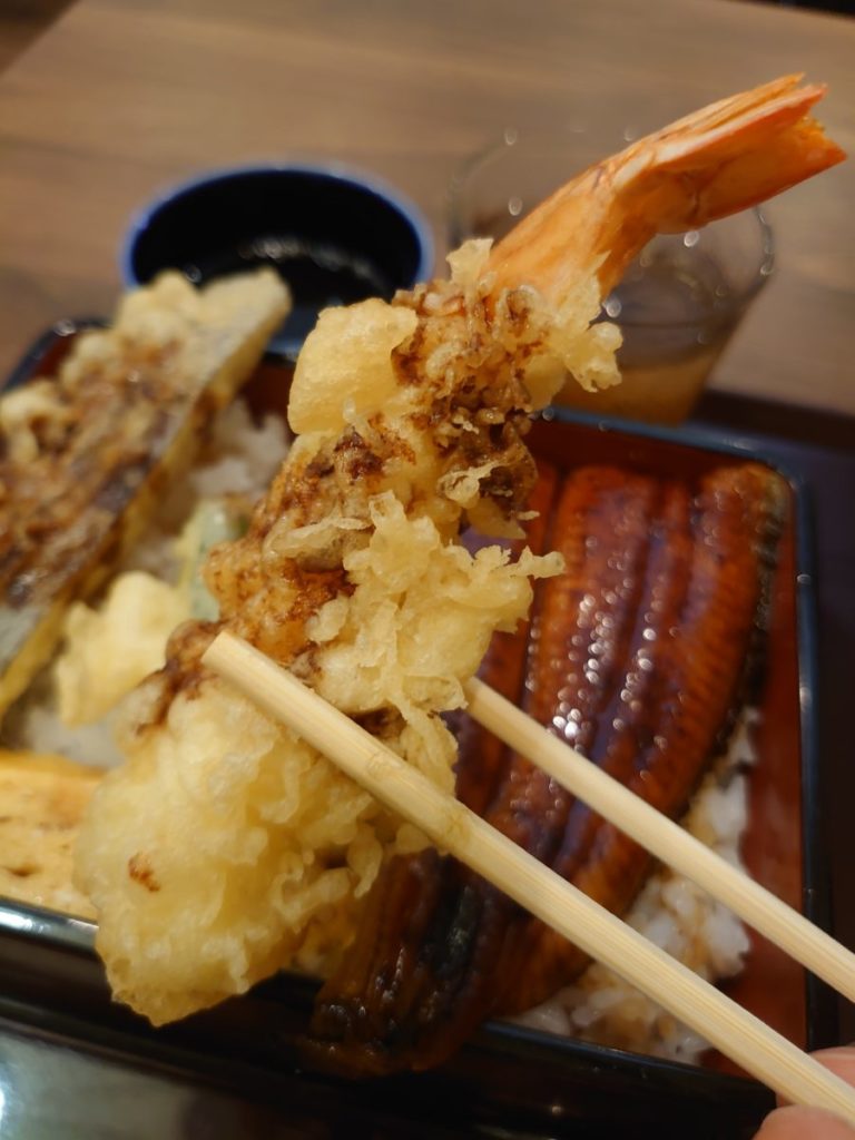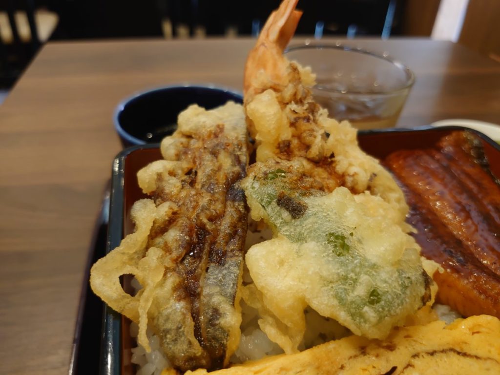 天ぷらは好物の海老とナスを含む三種盛りです。