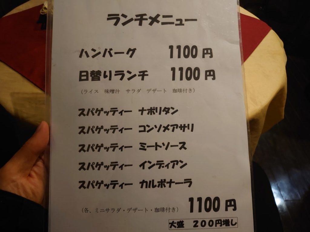 ランチメニューは、ハンバーグ、日替わり、5種類のスパゲッティー。