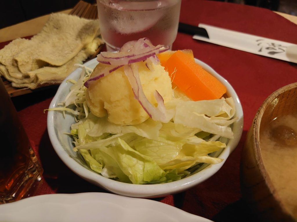 サラダにトッピングされているのはポテトサラダと思いきや、甘いサツマイモのサラダ。