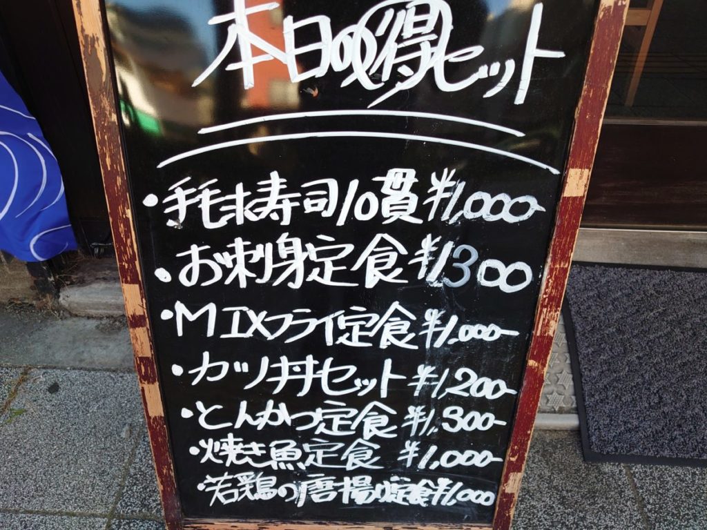 この日のランチメニューは、手毬寿司や刺身の他、かつ丼、とんかつ、ミックスフライ、焼魚、唐揚げ、うな丼とラインナップが広め。