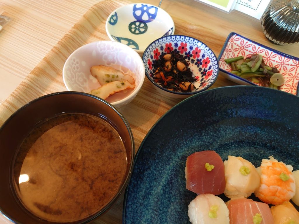手毬寿司の他、味噌汁と小鉢の一式をお盆にのせての提供でした。