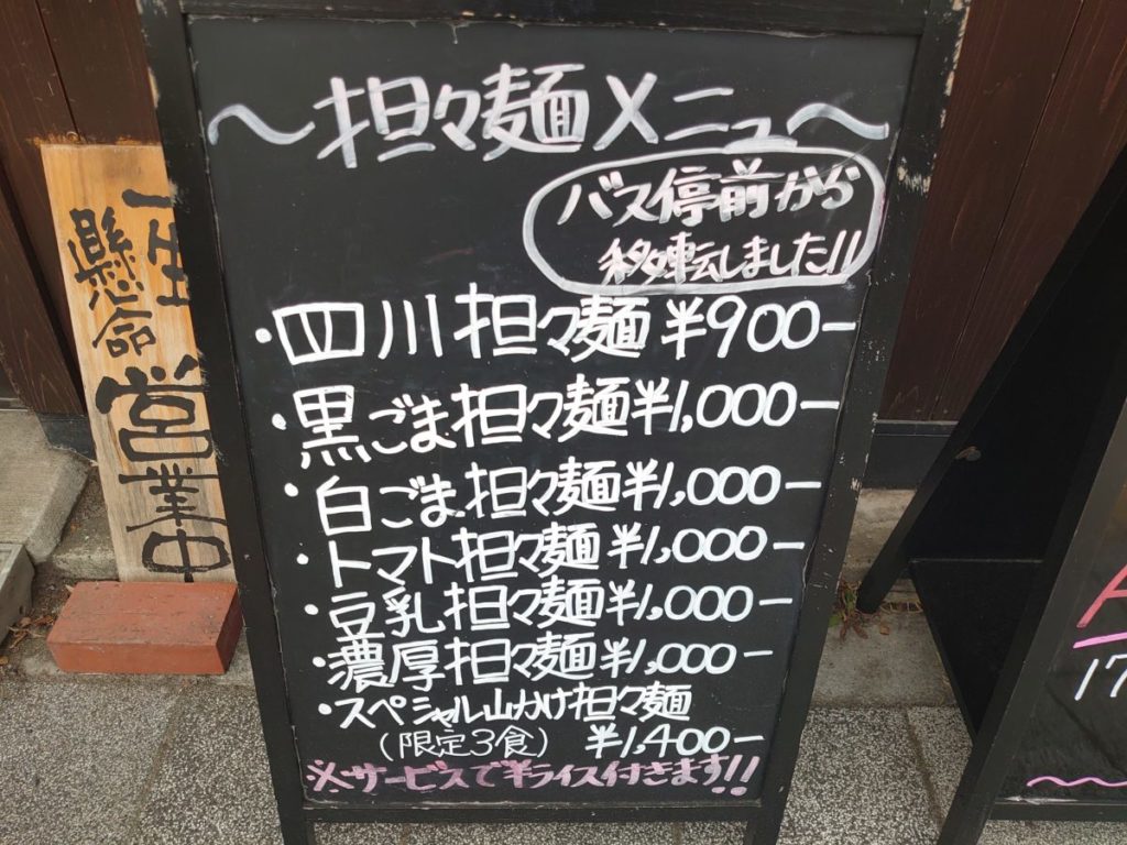 さらにバス停前にあった担々麺屋さんのメニューをいただくこともできます。