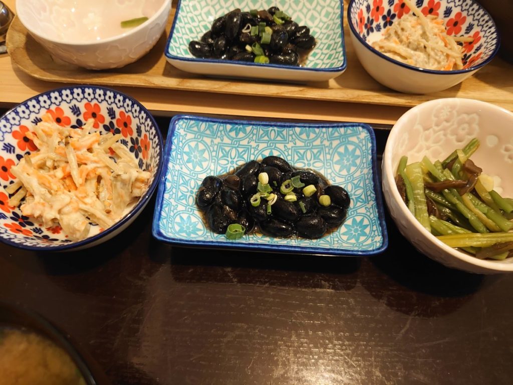 小鉢の黒いものは甘い黒豆でした。