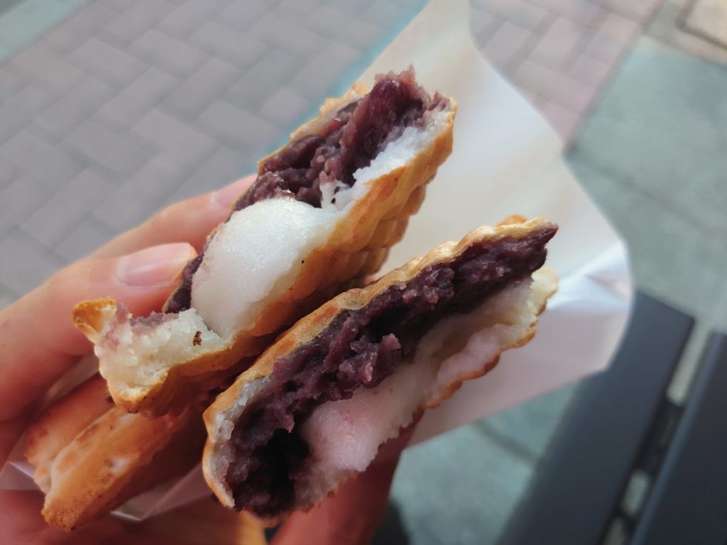 かぶりつく前に手でたい焼きを割ってビヨーンを楽しもうと思ったら、ビヨーンは無くて、ブツッと餅が切れてしまいました。