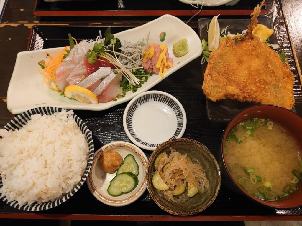 元祖高ひろ定食は、刺身3種、釜あげしらす、とろたく、アジフライに、麦めし、みそ汁、小鉢、漬物が付いた定食。