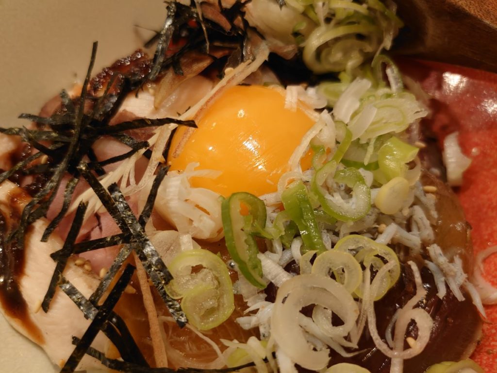 海苔、ミョウガ、ネギの下に生卵が隠れていました。