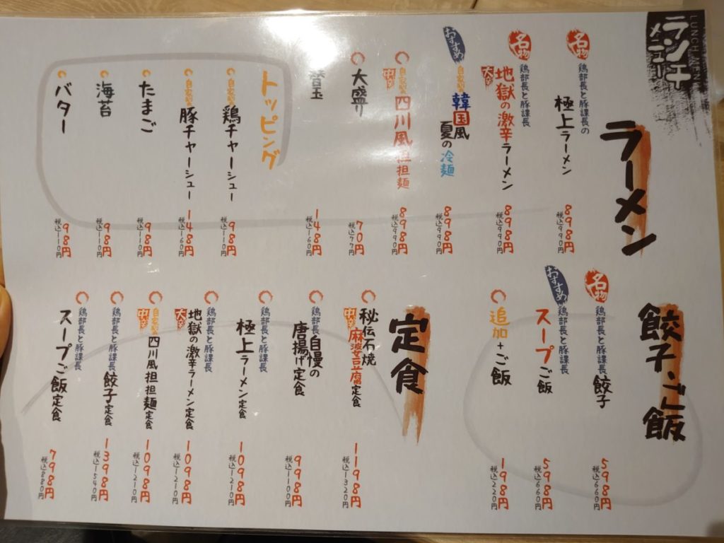 ランチメニューは、ラーメン、餃子・ご飯、定食というラインナップ。