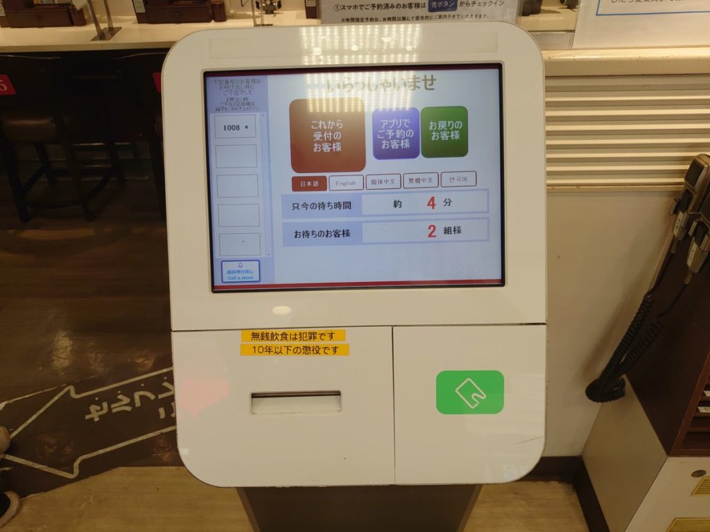 まずは店内入ってすぐの受付用のタッチパネルを済ませます。