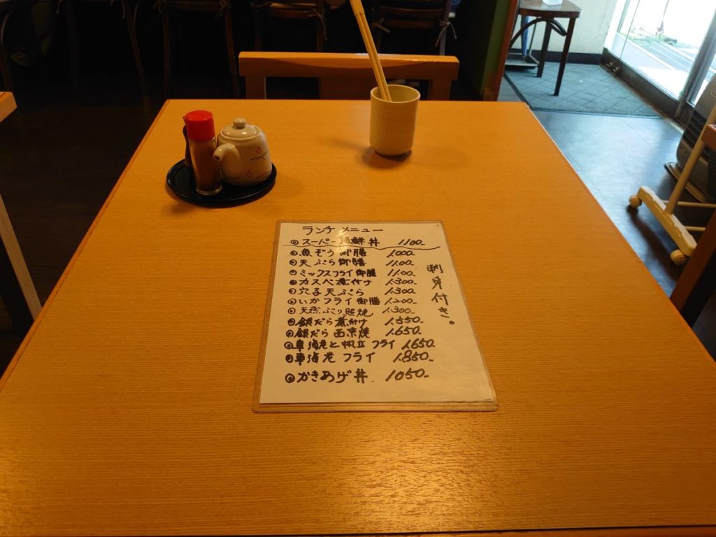 ランチメニューは、スーパー海鮮丼をはじめ、海鮮の天ぷら、煮付け、丼メニューが充実していました。