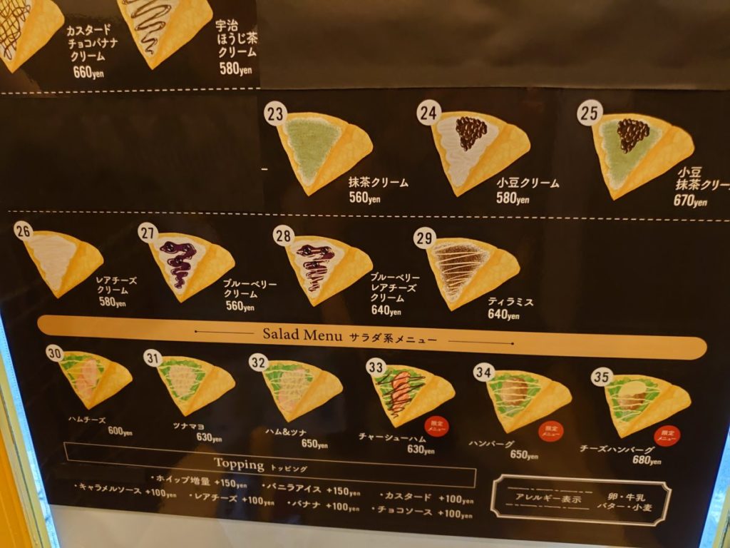 クレープメニューは、スイーツ系が29種類とサラダ系が6種類。