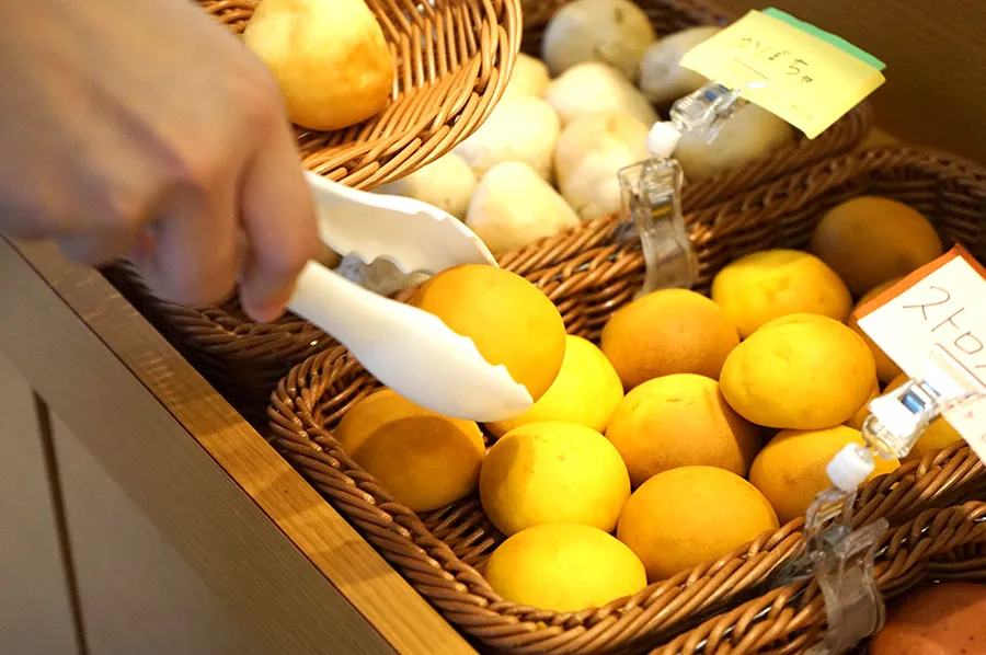 入口すぐに並べてあるポンデをかごに取って、ドリンクなどと一緒に会計するというスタイル。