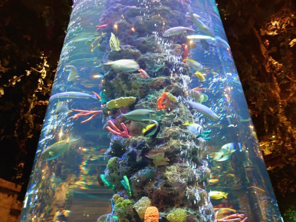 巨大な円柱の水槽で泳いでるのは本物の魚。